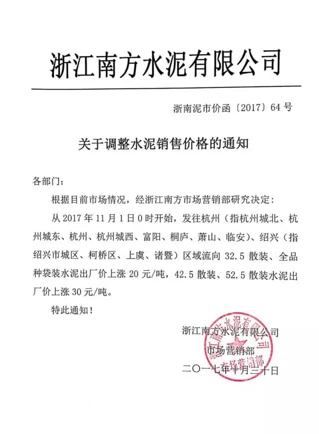 水泥人網(wǎng)11月1日消息,浙江南方水泥有限公司于10月30日率先發(fā)布調(diào)價(jià)通知并于昨日(11月1日)0時(shí)起,發(fā)往杭州(指杭州城北、杭州城東、杭州、杭州城西、富陽(yáng)、桐廬、蕭山、臨安)、紹興(指紹興市城區(qū)、柯橋區(qū)、上虞、諸暨)區(qū)域流向32.5散裝、全品種袋裝水泥出廠價(jià)上調(diào)20元/噸,42.5散裝、52.5散裝水泥出廠價(jià)上調(diào)30元/噸。調(diào)價(jià)通知如下: