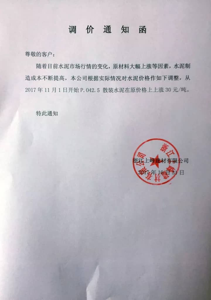 南方水泥在華東江浙滬一帶為主導(dǎo)生產(chǎn)企業(yè),這一波由南方水泥領(lǐng)漲,后期區(qū)域內(nèi)相關(guān)生產(chǎn)企業(yè)陸續(xù)跟漲。10月31日上峰水泥也發(fā)布調(diào)價(jià)通知,通知稱(chēng)自11月1日開(kāi)始P.O42.5散裝水泥在原價(jià)格基礎(chǔ)上上漲30元/噸。