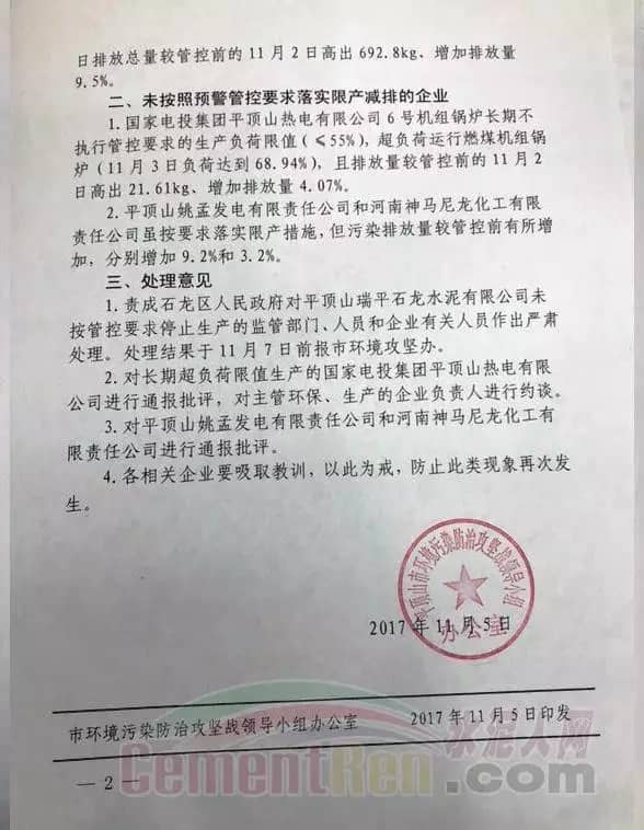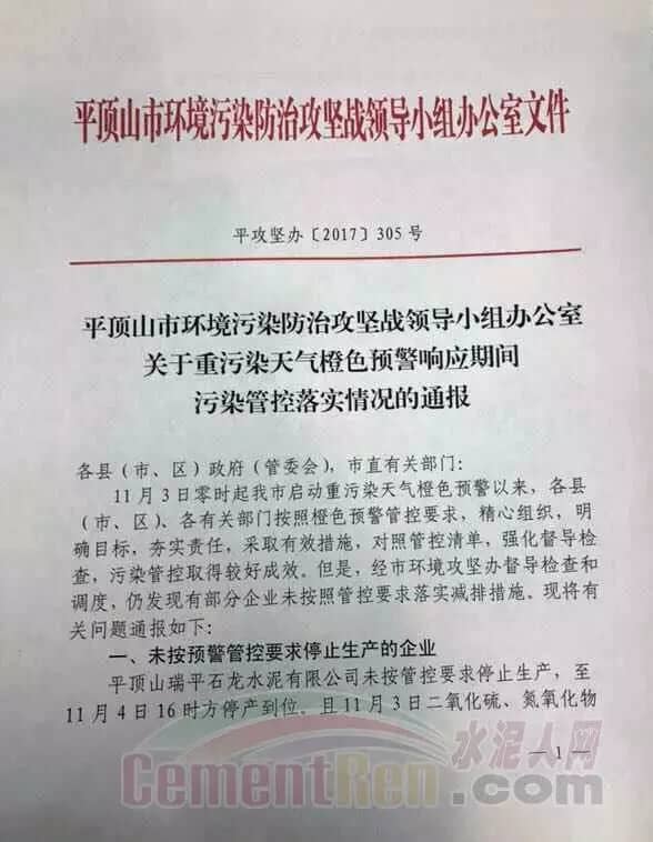 無獨(dú)有偶,平頂山市環(huán)境污染防治攻堅戰(zhàn)領(lǐng)導(dǎo)小組辦公室日前通報了在11月3日零時啟動重污染天氣橙色預(yù)警以后各縣(市、區(qū))未按照管控要求落實(shí)減排措施的企業(yè)和相關(guān)問題文件中稱:平頂山瑞平石龍水泥有限公司未按管控要求停止生產(chǎn),11月4日16時方停產(chǎn)到位。11月3日二氧化硫、氮氧化物日排放總量較管控前的11月2日高出692.8kg,增加排放量9.5%。