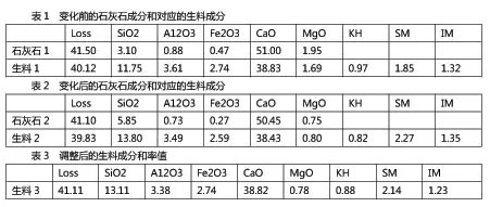某廠生料配比采用鈣鐵控制,控制指標(biāo)是CaO:38.83%、Fe2O3:2.74%,生料目標(biāo)值為KH:0.97;SM:1.85;IM:1.20。原料配比不變,“表1”是變化前的石灰石成分和對應(yīng)的生料成分,“表2”是變化后的石灰石成分和對應(yīng)的生料成分,可見由于石灰石成分變化,生料成分和率值發(fā)生很大變化。根據(jù)氧化鈣和三氧化二鐵的控制指標(biāo)進行原料配比調(diào)整,“表3”是調(diào)整后的生料成分和率值,可見氧化鈣和三氧化二鐵符合控制指標(biāo)要求,生料三率值并不符合目標(biāo)值要求,主要原因是二氧化硅和三氧化二鋁發(fā)生了大幅度的變化。