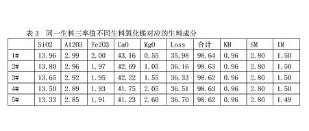“表3”是同一生料三率值,不同生料氧化鎂對應(yīng)的生料成分和率值,5組數(shù)據(jù)的三率值相同,氧化鎂不同,三氧化二鐵無很大變化,氧化鈣變化很大,數(shù)據(jù)表明:當(dāng)生料三率值不變時,不同生料氧化鎂對應(yīng)不同的生料氧化鈣,鈣鐵控制法的關(guān)鍵是保證石灰石氧化鎂穩(wěn)定,如果無法保證石灰石氧化鎂穩(wěn)定,必須同時測定出磨生料的氧化鎂,及時調(diào)整出磨生料氧化鈣的控制指標(biāo)。