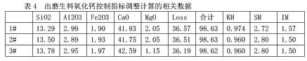 已知生料三率值的目標(biāo)值是KH:0.960;SM:2.80;IM:1.50;出磨生料的氧化鎂是1.15,“表4”是出磨生料氧化鈣控制指標(biāo)調(diào)整計算的相關(guān)數(shù)據(jù),1#是出磨生料最新的化學(xué)分析數(shù)據(jù),2#是計算的出磨生料標(biāo)準(zhǔn)成分,3#是計算的出磨生料氧化鎂標(biāo)準(zhǔn)成分,41.75和1.93分別是氧化鎂在2.05條件下的氧化鈣和三氧化二鐵的控制指標(biāo),42.59和1.97分別是氧化鎂在1.15條件下的氧化鈣和三氧化二鐵的控制指標(biāo)。