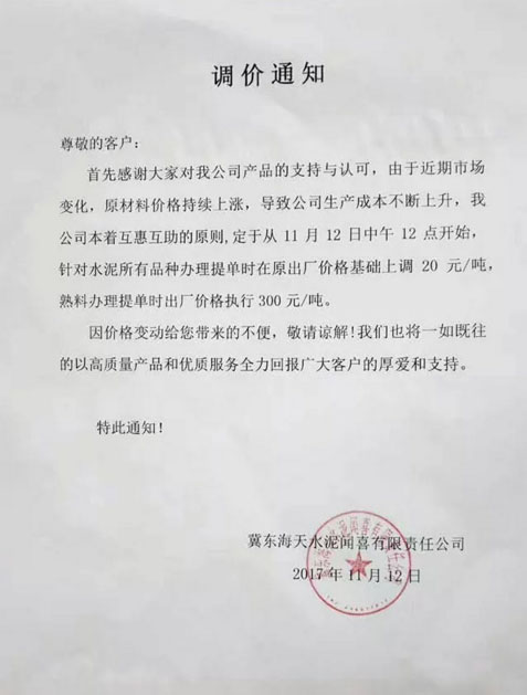 冀東海天水泥聞喜有限責(zé)任公司調(diào)價通知:由于近期市場變化,原材料價格持續(xù)上漲,導(dǎo)致公司生產(chǎn)成本不斷上升。本著互惠互助的原則,定于11月12日中午12點開始針對水泥所有品種辦理提單時在原出廠價格基礎(chǔ)上上調(diào)20元/噸,熟料辦理提單時出廠價格執(zhí)行300元/噸。