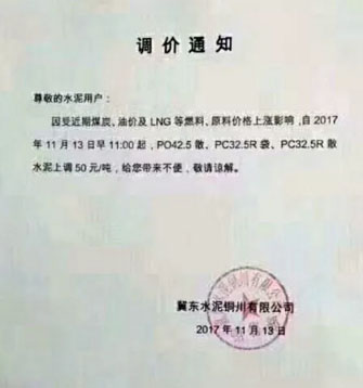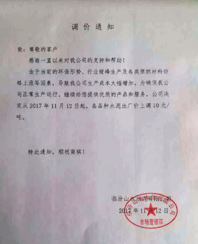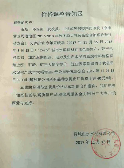 晉城山水水泥提價通知:近期,環(huán)保部、發(fā)改委、工信部等部委共同印發(fā)《京津冀及周邊地區(qū)2017-2018年秋冬季大氣污染綜合治理攻堅行動方案》,方案指出今年采暖季(2017年11月15日-2018年3月15日)“2+26”城市水泥建材行業(yè)全部停產(chǎn),限產(chǎn)已成常態(tài),加之近期能源、電力及生產(chǎn)水泥的原燃料材料價格持續(xù)上漲,礦渣、礦粉大幅度提價,這些因素都造成了我公司水泥生產(chǎn)成本大幅增加。經(jīng)公司決定自2017年11月13日9點對公司所有品種水泥出廠價格上調(diào)40元/噸。