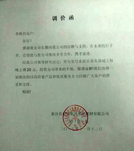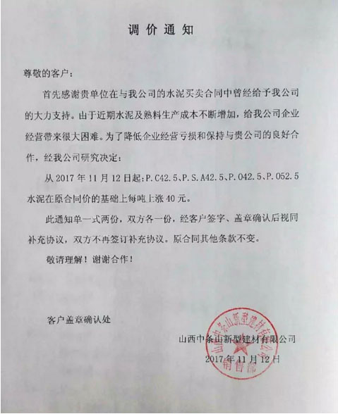 山西中條山新型建材有限公司提價通知:由于近期水泥及熟料生產(chǎn)成本不斷增加,給企業(yè)經(jīng)營帶來很大困難。為了降低企業(yè)經(jīng)營虧損和保持與客戶的良好合作,經(jīng)研究決定從11月12日起對各品種水泥在原合同價的基礎(chǔ)上每噸上漲40元。