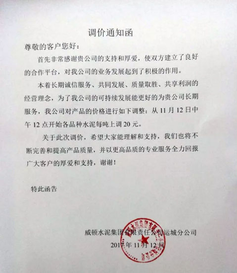 威頓水泥調(diào)價通知:自11月12日中午12點開始對旗下各品種水泥每噸上調(diào)20元。