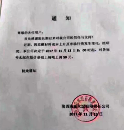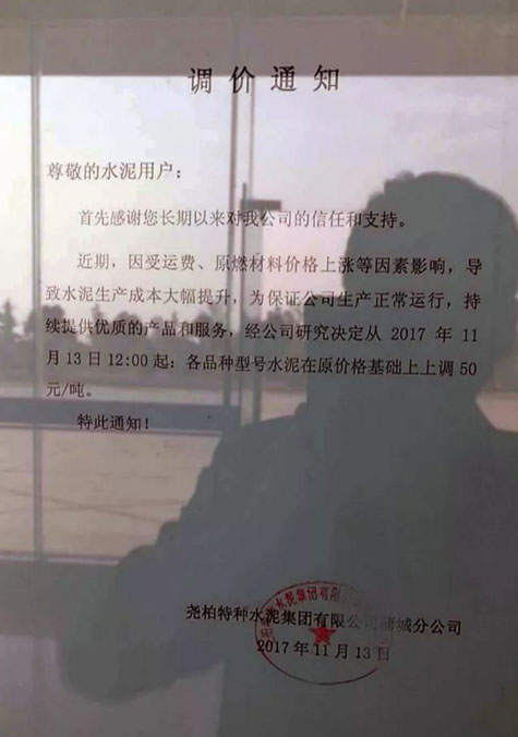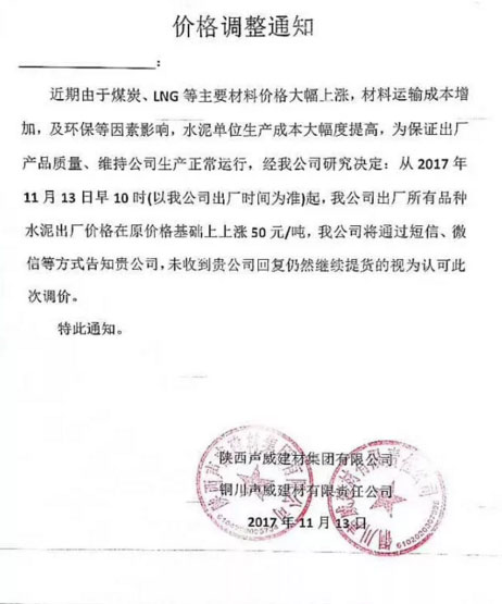 陜西聲威建材集團有限公司銅川聲威建材有限責(zé)任公司提價通知:由于近期煤炭、LNG等主要材料價格大幅上漲,材料運輸成本增加及環(huán)保等因素影響,水泥單位生產(chǎn)成本大幅度提高,為保證出廠產(chǎn)品質(zhì)量,維持公司生產(chǎn)正常運行,經(jīng)研究決定,從2017年11月13日早10點起所有品種水泥出廠價格在原價格基礎(chǔ)上上漲50元/噸。