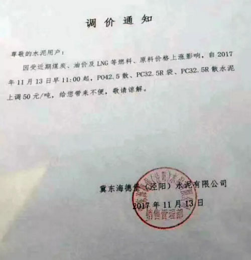 冀東海德堡(涇陽)水泥有限公司提價通知