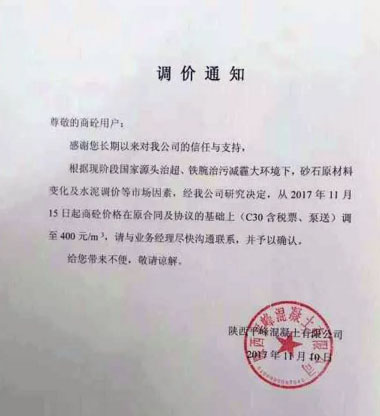 陜西平峰混凝土有限公司提價通知:根據(jù)現(xiàn)階段國家源頭治超、鐵腕治污減霾大環(huán)境下,砂石原材料變化及水泥調(diào)價等市場因素,經(jīng)公司研究決定從2017年11月15日起商砼價格在原合同及基礎(chǔ)上(C30含稅票、泵送)調(diào)至400元/立方。