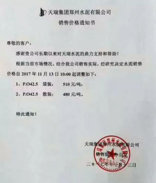 天瑞集團鄭州水泥有限公司銷售價格通知:根據(jù)當(dāng)前市場,結(jié)合公司銷售實際,經(jīng)研究決定水泥銷售價格自2017年11月13日起調(diào)整為:P.O42.5袋裝510元/噸;P.O42.5散裝480元/噸。