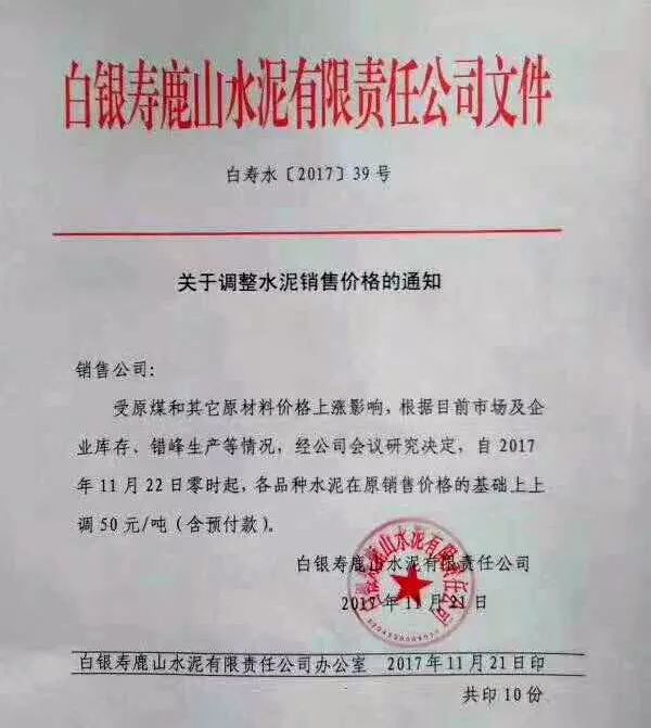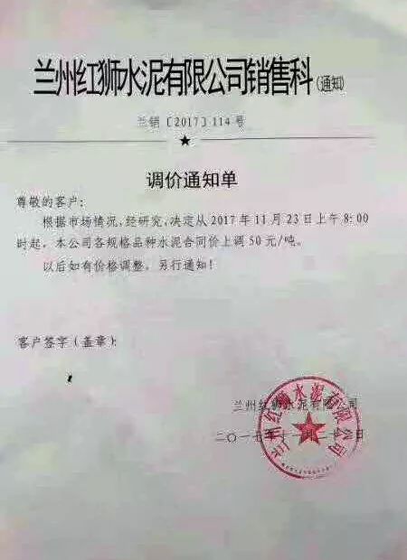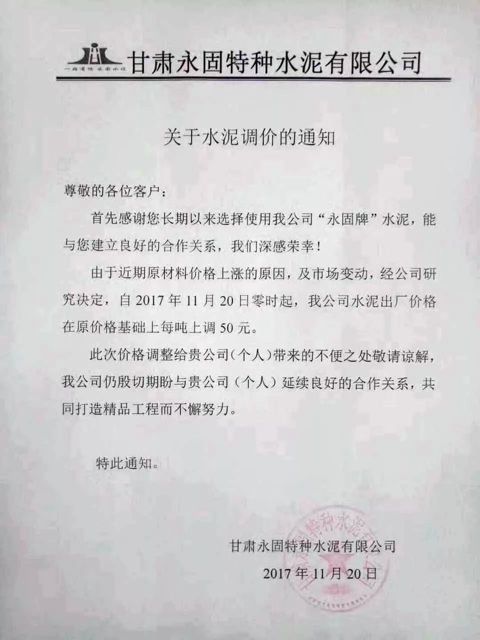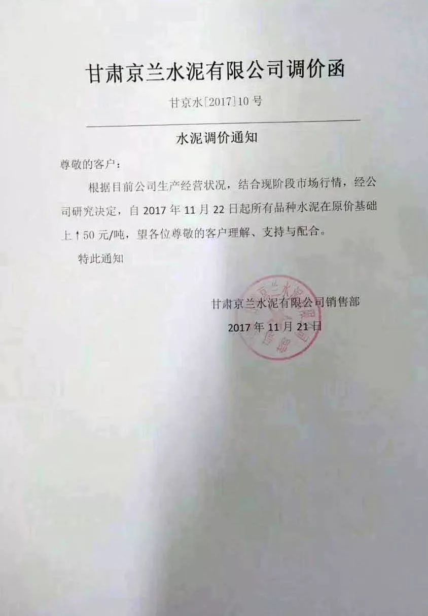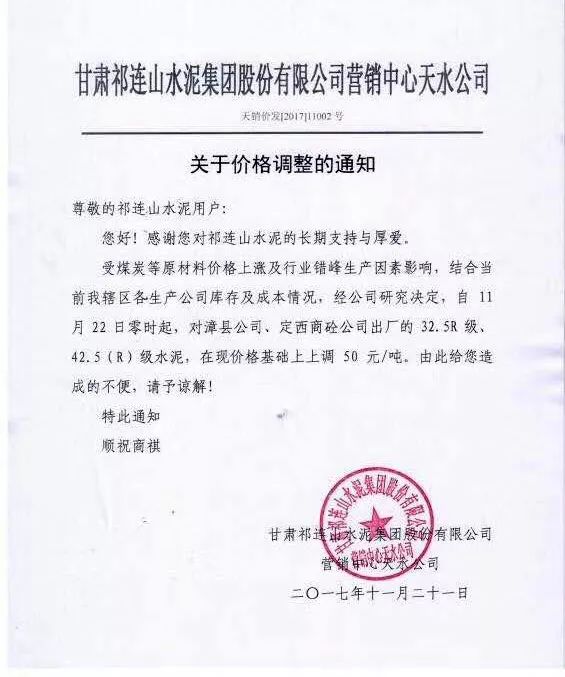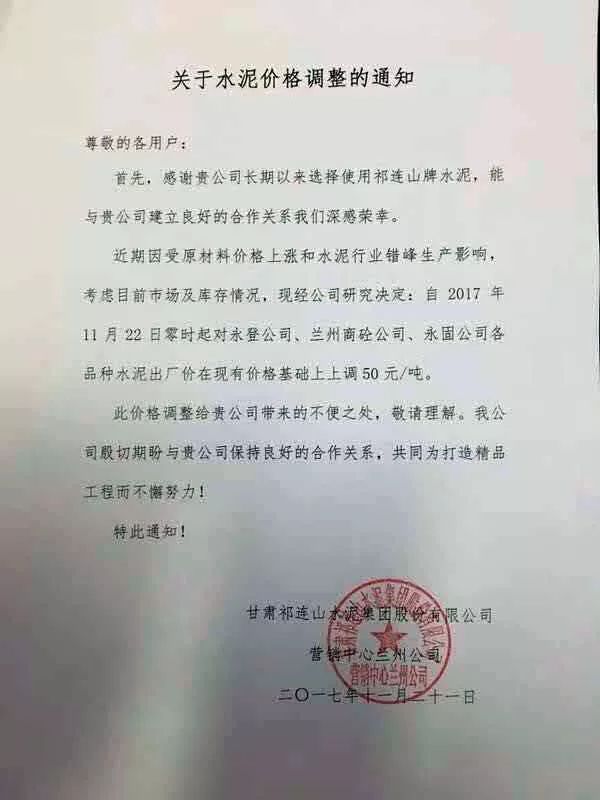 區(qū)域主導(dǎo)企業(yè)祁連山水泥價格調(diào)整通知稱:因受原材料價格上漲和水泥行業(yè)錯峰生產(chǎn)影響,考慮目前市場及庫存情況,經(jīng)公司研究決定,自2017年11月22日零時起對永登公司、蘭州商砼公司、永固公司各品種水泥出廠價在現(xiàn)有價格基礎(chǔ)上上調(diào)50元/噸。
