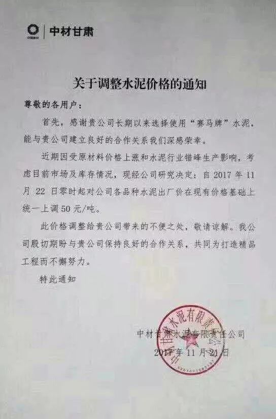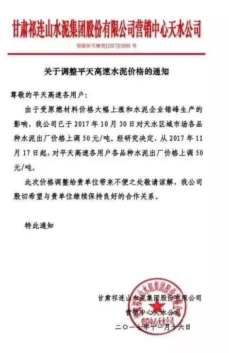 甘肅祁連山水泥集團股份有限公司營銷中心天水公司關(guān)于調(diào)整平天高速水泥價格的通知稱,由于受原燃材料價格大幅上漲和水泥企業(yè)錯峰生產(chǎn)的影響,公司已于2017年10月30日對天水區(qū)域市場各品種水泥出廠價格上調(diào)50元/噸。經(jīng)研究決定從2017年11月17日起,對平天高速各用戶各品種水泥出廠價格上調(diào)50元/噸。