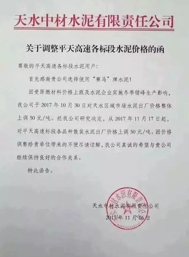 此前區(qū)域主導(dǎo)企業(yè)就曾針對重點工程做過價格調(diào)價。天水中材水泥有限責(zé)任公司關(guān)于調(diào)整平天高速各標(biāo)段水泥價格的函:因受原燃材料價格上漲及水泥企業(yè)實施冬季錯峰生產(chǎn)影響,公司于2017年10月30日對天水區(qū)域市場水泥 出廠價格整體上調(diào)50元/噸。經(jīng)公司決定從11月17日起,對平天高速標(biāo)段各品種散裝水泥出廠價格上調(diào)50元/噸。