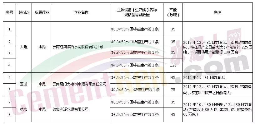 【水泥人網(wǎng)】按照《國(guó)務(wù)院關(guān)于化解產(chǎn)能嚴(yán)重過(guò)剩矛盾的指導(dǎo)意見(jiàn)》(國(guó)發(fā)〔2013〕41號(hào))、《國(guó)務(wù)院辦公廳關(guān)于促進(jìn)建材工業(yè)穩(wěn)增長(zhǎng)調(diào)結(jié)構(gòu)增效益的指導(dǎo)意見(jiàn)》(國(guó)辦發(fā)〔2016〕34號(hào))及《工業(yè)和信息化部關(guān)于印發(fā)部分產(chǎn)能嚴(yán)重過(guò)剩行業(yè)產(chǎn)能置換實(shí)施辦法的通知》(工信部產(chǎn)業(yè)〔2015〕127號(hào))、《工業(yè)和信息化部國(guó)家發(fā)改委關(guān)于印發(fā)水泥行業(yè)部分項(xiàng)目處理意見(jiàn)的通知》(工信部聯(lián)原〔2016〕118號(hào))、《云南省人民政府辦公廳關(guān)于嚴(yán)格落實(shí)產(chǎn)能置換著力化解水泥行業(yè)產(chǎn)能過(guò)剩矛盾的實(shí)施意見(jiàn)》(云政辦發(fā)〔2017〕44號(hào))的有關(guān)要求,云南紅塔滇西水泥股份有限公司賓川分公司日產(chǎn)6000噸、云南易門大椿樹(shù)水泥有限責(zé)任公司日產(chǎn)4000噸、盈江昆鋼榕全水泥有限公司日產(chǎn)2000噸新型干法水泥熟料建設(shè)項(xiàng)目產(chǎn)能置換方案已經(jīng)省人民政府確認(rèn),現(xiàn)予公告,詳見(jiàn)附件。