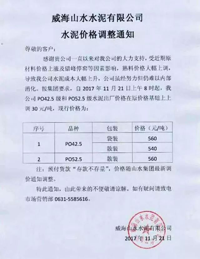【水泥人網(wǎng)】近日,山東省的水泥熟料價格大漲,多家企業(yè)通知下游客戶價格上調(diào)。其中威海山水水泥有限公司水泥價格調(diào)整通知稱,受近期原材料價格上漲及錯峰停窯因素影響,熟料價格大幅上調(diào),導(dǎo)致公司水泥成本大幅上升。公司雖經(jīng)努力但仍難以內(nèi)部消化。按集團(tuán)要求自2017年11月21日上午8時起,PO42.5級和PO52.5級水泥出廠價格在原價格基礎(chǔ)上上調(diào)30元/噸?,F(xiàn)行價格PO42.5水泥袋裝價格560元/噸,散裝價格540元/噸。PO52.5散裝水泥560元/噸。