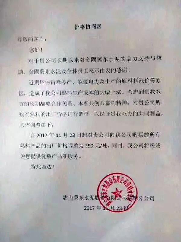 河北省主導(dǎo)企業(yè)唐山冀東水泥于昨日發(fā)布了熟料價格協(xié)商函,《價格協(xié)商函》稱因近期環(huán)保錯峰停產(chǎn)、能源電力及生產(chǎn)的原材料漲價等原因,造成了公司熟料生產(chǎn)成本的大幅上漲??紤]到長期戰(zhàn)略合作關(guān)系,本著共贏的精神,自23日起熟料出廠價格上調(diào)為350元/噸 。