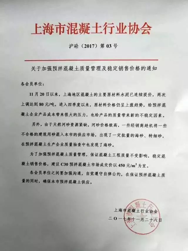 為了加強預拌混凝土質量管理,保證混凝土工程質量不受影響,穩(wěn)定混凝土銷售價格,建議C30預拌混凝土市場成交價以450元/立方為宜。