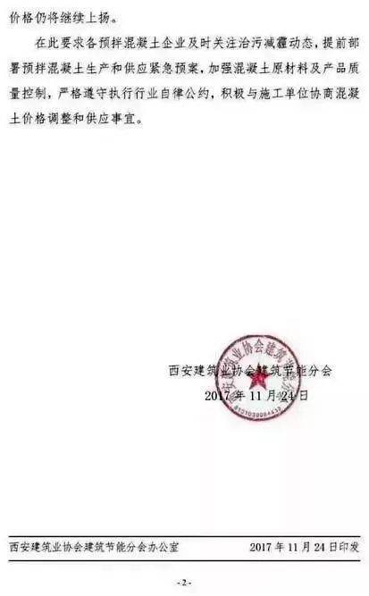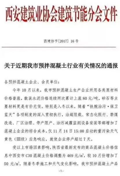 此前西安建筑業(yè)協會建筑節(jié)能分會曾發(fā)布關于近期西安預拌混凝土行業(yè)有關情況的通報,通報稱,今年10月以來,西安市預拌混凝土生產企業(yè)所用各類原材料價格普漲,散裝水泥價格連續(xù)兩次累計上漲80元/噸,砂石等主要材料更是有價無貨。特別是入冬以來,隨著“鐵腕治污,保衛(wèi)藍天”各項制度的深入貫徹執(zhí)行,治超限載,常態(tài)化限行、禁煤改造,廠區(qū)治理,停產限產、治污減霾監(jiān)測設備安裝等都增加了混凝土企業(yè)的綜合成本。僅11月14日15:00啟動的重污染天氣黃色應急響應,就使企業(yè)停產超過七天。