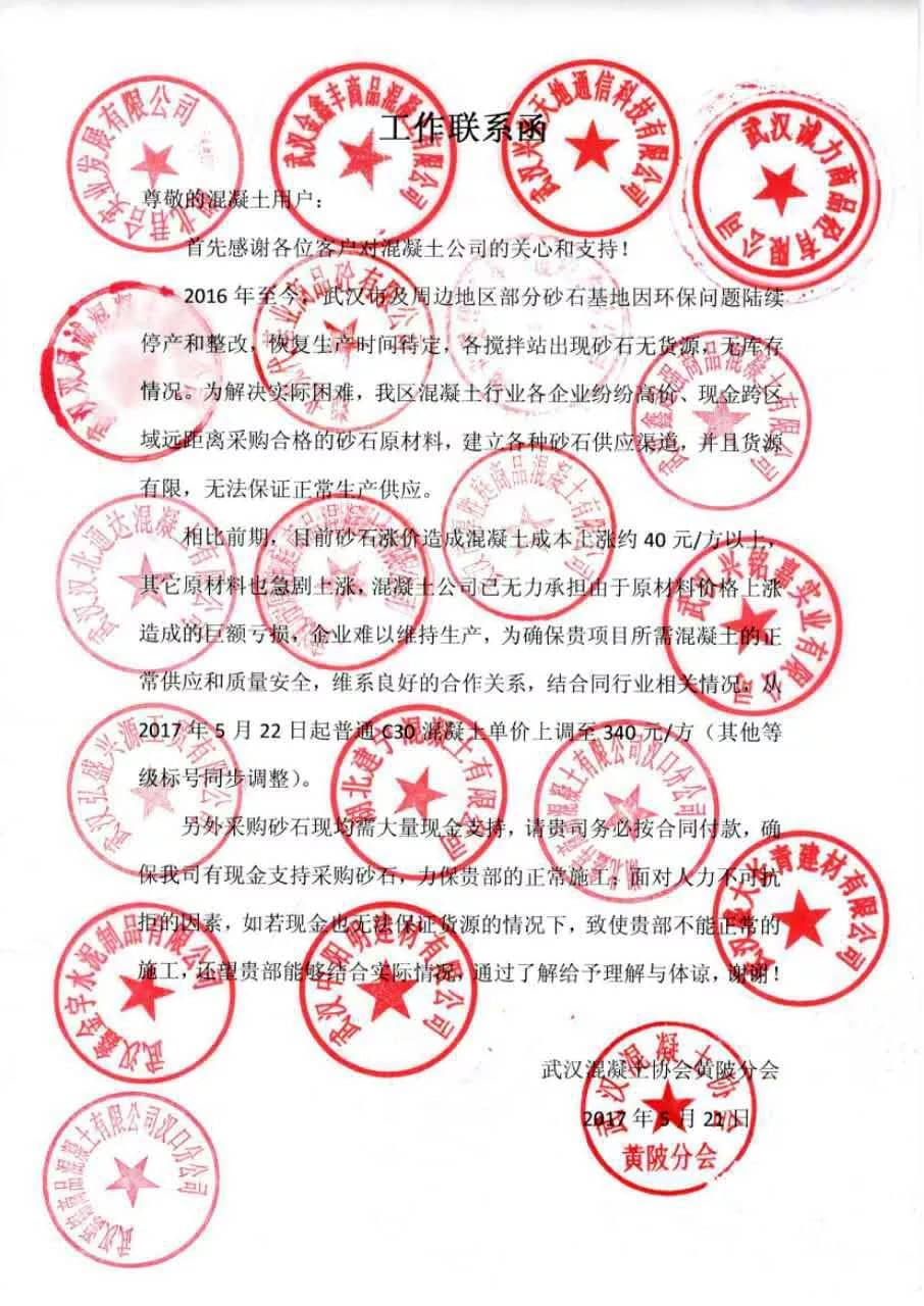 今年五月份的時候,武漢混凝土協會黃陂分會就曾發(fā)布工作聯系函,聯系函稱,2016年至今,武漢市及周邊地區(qū)部分砂石基地因環(huán)保問題陸續(xù)停產和整改,恢復生產時間待定,各攪拌站出現砂石無貨源,無庫存情況。為解決實際困難,區(qū)混凝土行業(yè)各企業(yè)紛紛高價、現金跨區(qū)域遠距離采購合格的砂石原材料,建立各種砂石供應渠道,并且貨源有限,無法保證正常生產供應。
