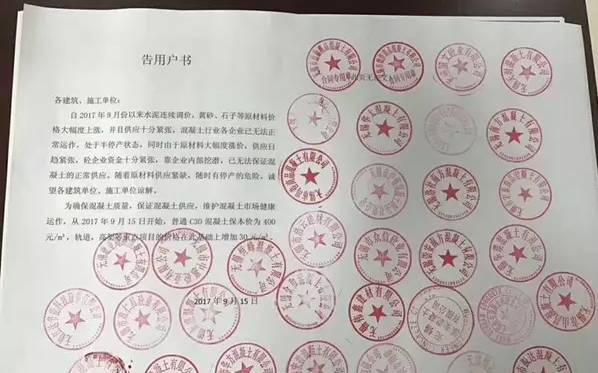 告用戶書表示,自2017年9月份以來,水泥連續(xù)系調價,黃砂、石子等原材料價格大幅度上漲,并且供應十分緊張,混凝土行業(yè)各企業(yè)已無法正常運作,處于半停產狀態(tài),同時由于原材料大幅度漲價,供應日趨緊張,混凝土企業(yè)資金十分緊張,靠企業(yè)內部挖潛,已無法保證混凝土的正常供應。隨著原材料供應緊缺,隨時有停產的危險,希望各建筑、施工單位諒解。