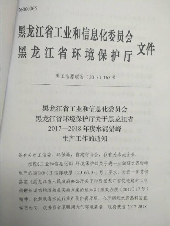 黑龍江省工業(yè)和信息化委員會黑龍江省環(huán)境保護(hù)廳關(guān)于黑龍江省2017-2018年度水泥錯峰