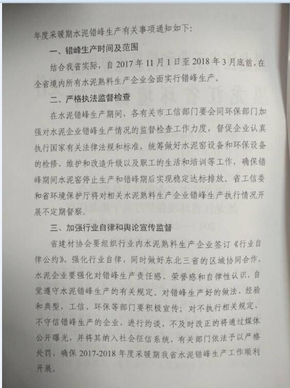 【水泥人網(wǎng)】近日,黑龍江省工信委黑龍江省環(huán)保廳聯(lián)合發(fā)布《關(guān)于黑龍江省2017-2018年度水泥錯峰生產(chǎn)工作的通知》,將于2017年11月1日至2018年3月底前,在全省境內(nèi)所有水泥熟料生產(chǎn)企業(yè)全面實行錯峰生產(chǎn)。