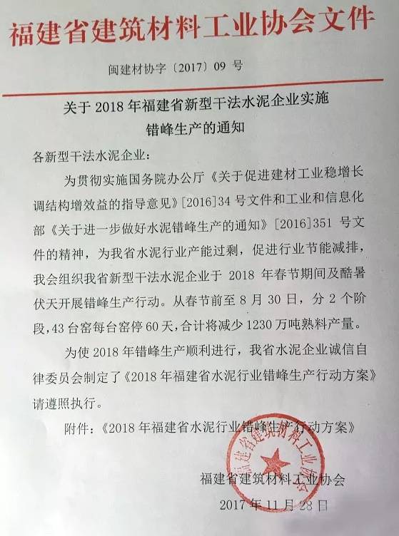 通知稱,為貫徹實施國務院辦公室廳《關(guān)于促進建材工業(yè)穩(wěn)增長調(diào)結(jié)構(gòu)增效益的指導意見》的精神,為福建省水泥行業(yè)產(chǎn)能過剩,促進行業(yè)節(jié)能減排,福建省建筑材料工業(yè)協(xié)會將組織省內(nèi)新型干法水泥企業(yè)于2018年春節(jié)期間及酷暑伏天開展錯峰生產(chǎn)行動。