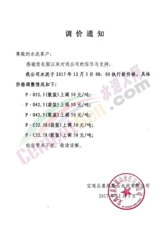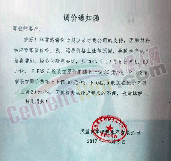 因原材料供應(yīng)緊張及價(jià)格上漲、運(yùn)費(fèi)價(jià)格上漲等原因,導(dǎo)致生產(chǎn)成本急劇增加。經(jīng)公司研究決定,從2017年12月5日早8點(diǎn)開始,P.F32.5袋裝水泥在原價(jià)基礎(chǔ)上上調(diào)30元/噸,P.O42.5袋裝在原價(jià)基礎(chǔ)上上調(diào)30元/噸。P.O42.5散裝在原價(jià)基礎(chǔ)上上調(diào)20元/噸。