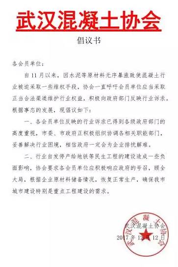 二、行業(yè)自發(fā)停產(chǎn)給地鐵等民生工程的建設(shè)造成一些負面影響,協(xié)會要求各會員單位積極響應(yīng)政府的號召,顧全大局,根據(jù)企業(yè)原材料儲備情況?;謴?fù)正常生產(chǎn),確保武漢市城市建設(shè)特別是重點工程的需求。