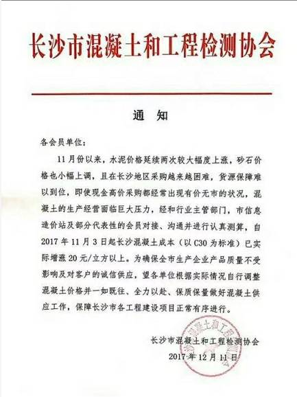 12月11日,湖南長沙市混凝土和工程檢測協(xié)會發(fā)布通知稱自11月份以來,水泥價格延續(xù)兩次較大幅度上漲,砂石價格也有小幅上調(diào),且在長沙地區(qū)采購越來越困難,貨源保障難以到位,即使現(xiàn)金高價采購都經(jīng)常出現(xiàn)有價無市的狀況,混凝土的生產(chǎn)經(jīng)營面臨巨大壓力,經(jīng)和行業(yè)主管部門,市信息造價站及部分代表性的會員對接、溝通并進行認真測算,自2017年11月3日起長沙混凝土成本(以C30為標準)已實際增漲20元/立方以上。