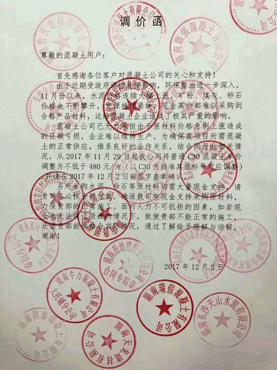 混凝土公司已無力承擔由于原材料價格急劇上漲造成的巨額虧損,企業(yè)難以維持生產(chǎn)。這確保項目所需混凝土的正常供應(yīng),維系良好合作關(guān)系,結(jié)合同行業(yè)相關(guān)情況自11月29日起將普通C30混凝土單價調(diào)整為不低于480元/方(以C30為標準其他標號對應(yīng)調(diào)整),并在12月2日前簽字蓋章確認。