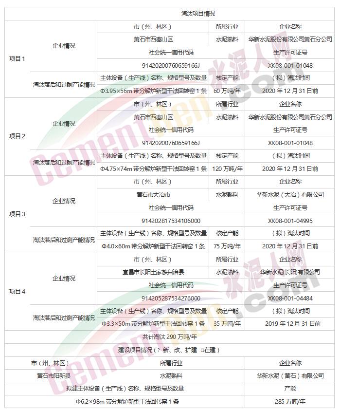 【水泥人網(wǎng)】日前湖北省經(jīng)信委發(fā)布《關(guān)于華新水泥股份公司年產(chǎn)285萬噸水泥熟料生產(chǎn)線項(xiàng)目產(chǎn)能置換方案的公告》。