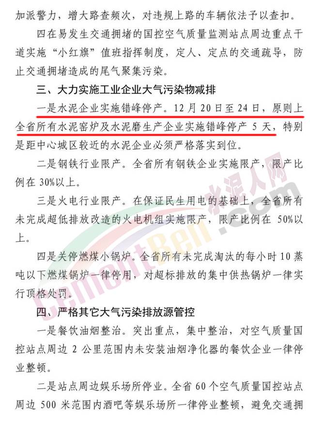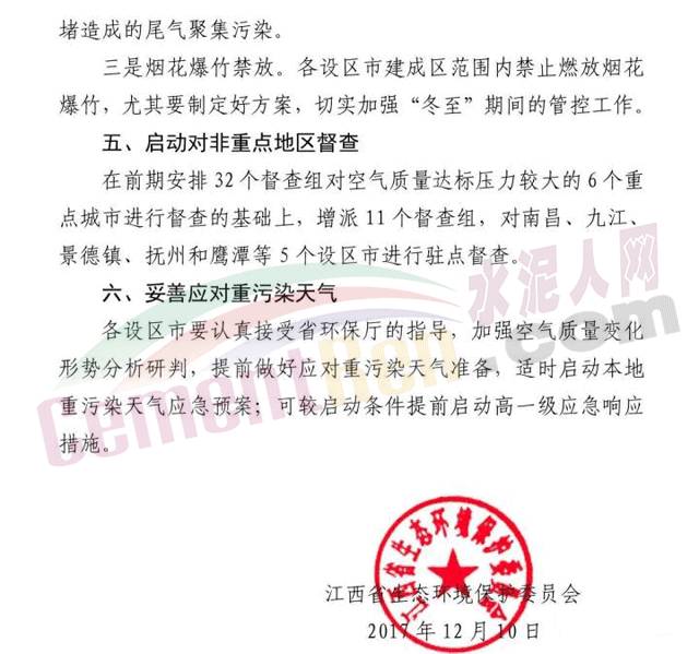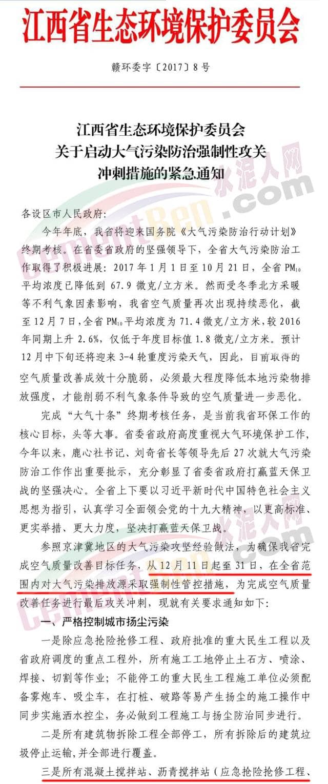 【水泥人網(wǎng)】近日,江西省生態(tài)環(huán)境保護委員會發(fā)布了關于啟動大氣污染防治強制性攻關沖刺措施的緊急通知,通知要求參照京津冀地區(qū)的大氣污染攻堅經(jīng)驗作法,確保江西全省完成空氣質量改善目標任務,從12月11日起至31日在全省范圍內對大氣污染排放源采取強制管控措施。對所有混凝土攪拌站(應急搶險搶修工程、政府批準的重大民生工程以及省政府調度的重點工程除外)全部停產(chǎn)。以水泥企業(yè)實施錯峰停產(chǎn)。12月20日至24日,全省所有水泥窯爐及水泥磨生產(chǎn)企業(yè)實施錯峰停產(chǎn)5天,特別是距中心城區(qū)較近的水泥企業(yè)必須嚴格落實到位。
