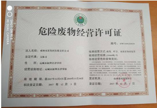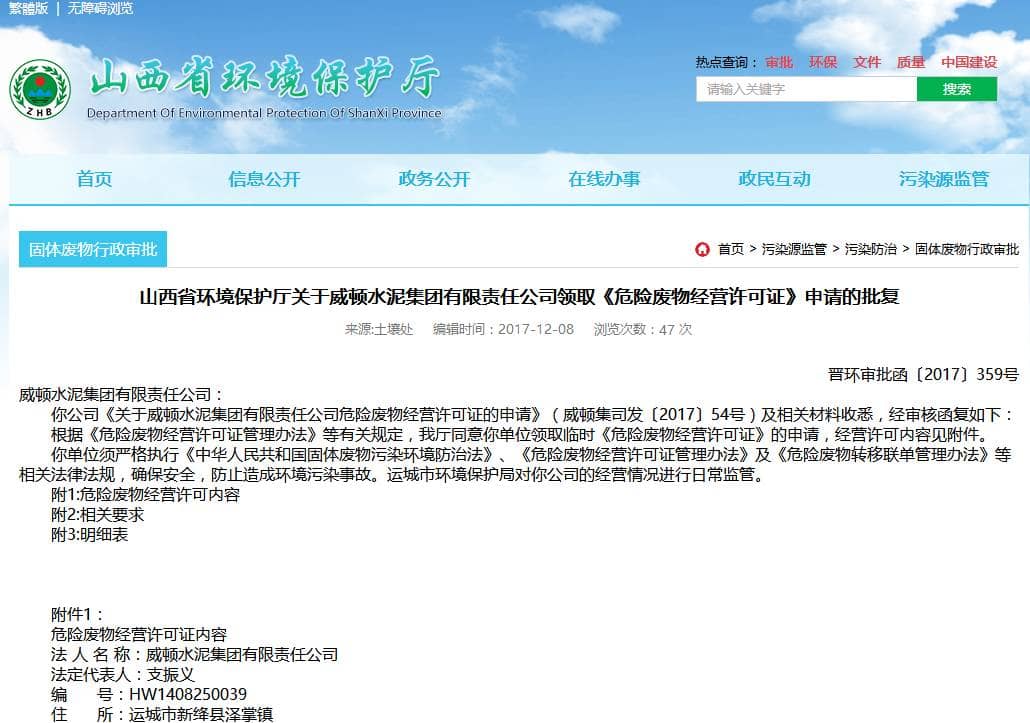 12月8日山西省環(huán)保廳在其官網(wǎng)上公開公布了關(guān)于威頓水泥集團(tuán)有限責(zé)任公司領(lǐng)取《危險(xiǎn)廢物經(jīng)營許可證》申請的批復(fù)。