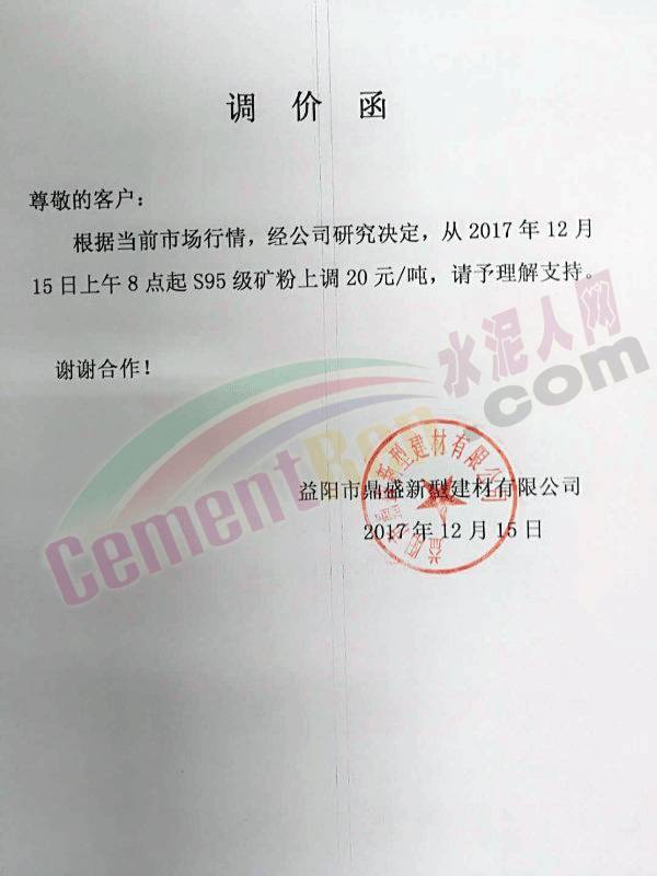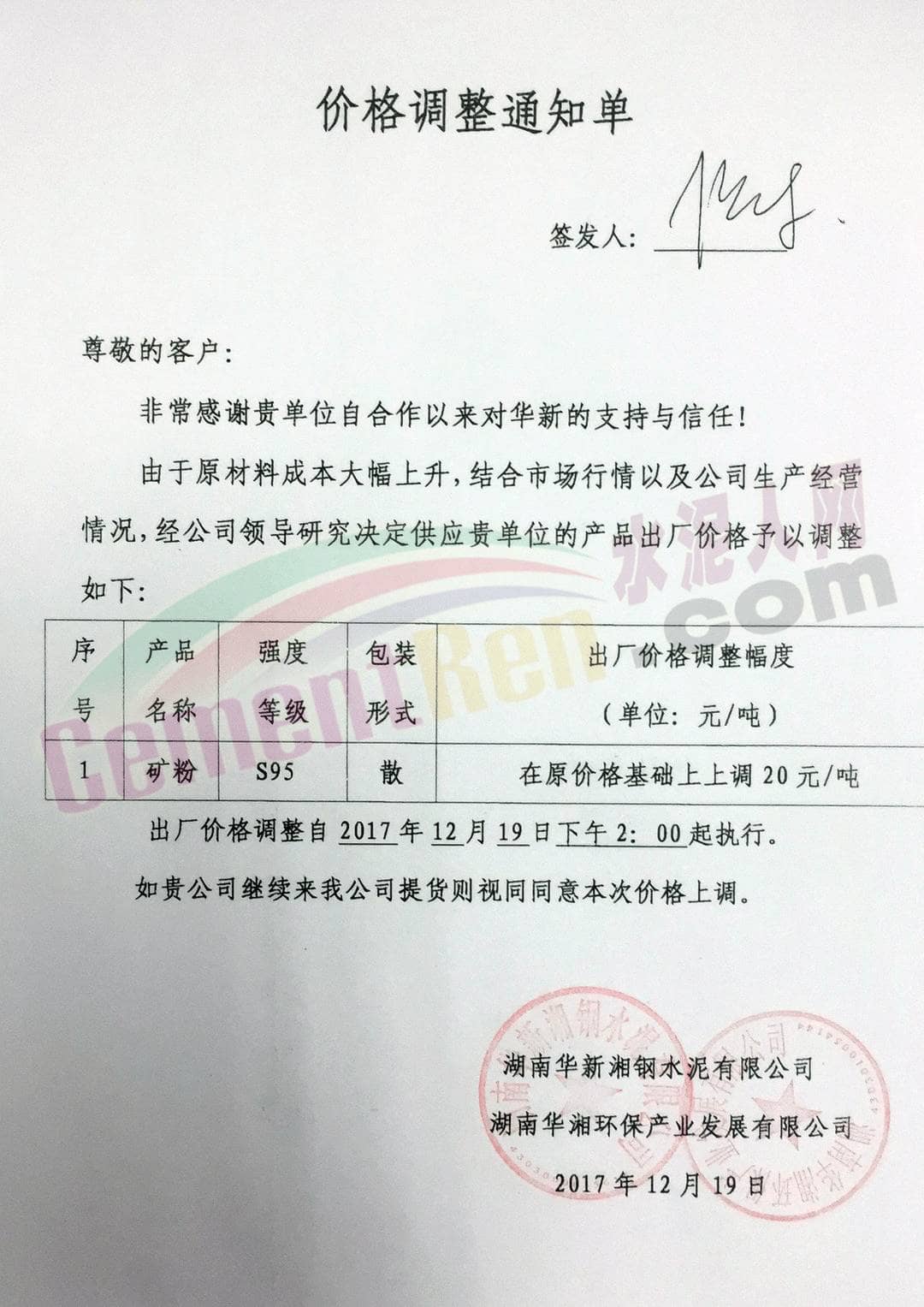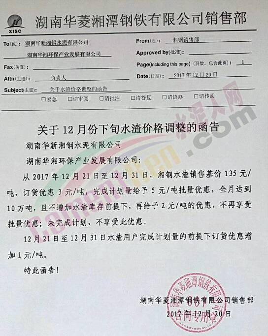 12月20日,湖南華菱湘潭鋼鐵有限公司銷售部向湖南華新湘鋼水泥公司 湖南華湘環(huán)保產(chǎn)業(yè)發(fā)展有限公司發(fā)出關(guān)于12月下旬水渣價格調(diào)整的通知。