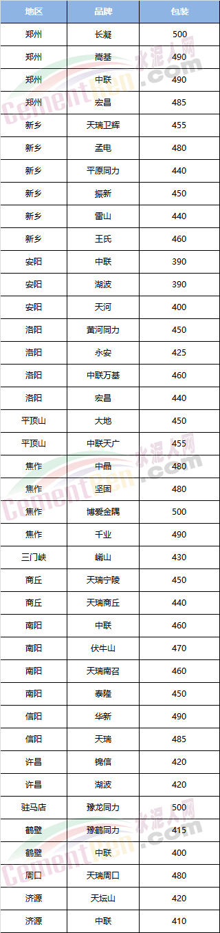 河南區(qū)域PC32.5袋裝水泥參考報(bào)價(jià)