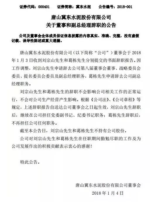 【水泥人網(wǎng)】日前,冀東水泥發(fā)布關(guān)于董事和副總經(jīng)理辭職的公告。公告稱,董事會于 2018年 1 月 3 日收到劉宗山先生和葛棟先生分別提交的書面辭職報告。因工作調(diào)整,劉宗山先生申請辭去公司第八屆董事會董事、戰(zhàn)略委員會委員、提名委員會委員及副總經(jīng)理職務(wù),葛棟先生申請辭去公司副總經(jīng)理職務(wù)。