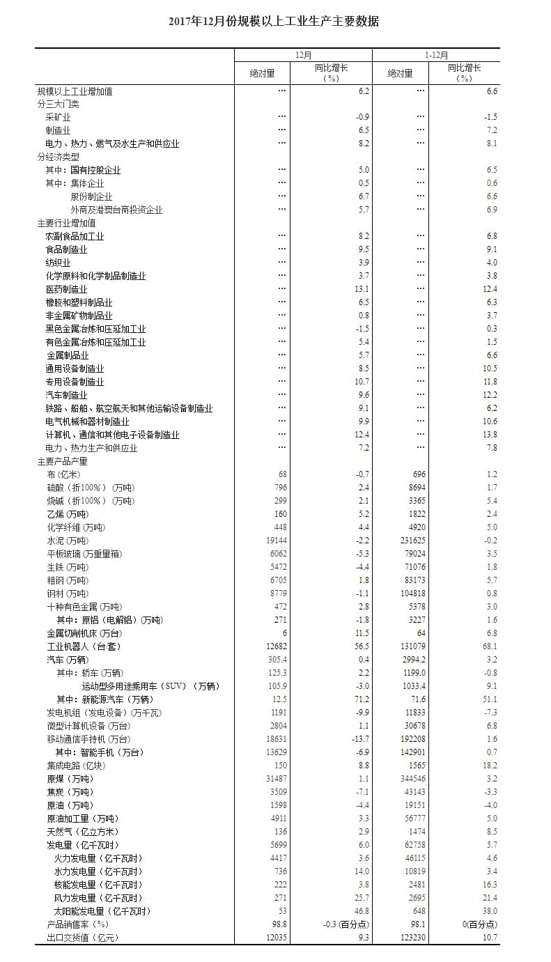 分產(chǎn)品看,12月份,596種產(chǎn)品中有331種產(chǎn)品同比增長(zhǎng)。其中,鋼材8779萬(wàn)噸,同比下降1.1%;水泥19144萬(wàn)噸,下降2.2%;十種有色金屬472萬(wàn)噸,增長(zhǎng)2.8%;乙烯160萬(wàn)噸,增長(zhǎng)5.2%;汽車305.4萬(wàn)輛,增長(zhǎng)0.4%;轎車125.3萬(wàn)輛,增長(zhǎng)2.2%;發(fā)電量5699億千瓦時(shí),增長(zhǎng)6.0%;原油加工量4911萬(wàn)噸,增長(zhǎng)3.3%。