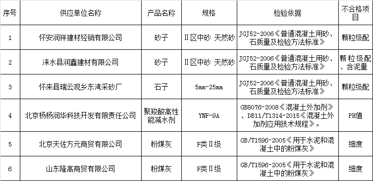 檢查發(fā)現(xiàn),懷安潤(rùn)祥建材經(jīng)銷有限公司等6家企業(yè)供應(yīng)的混凝土原材料共計(jì)6組抽檢樣品經(jīng)檢測(cè)判定為不合格。依照《關(guān)于印發(fā)<北京市建設(shè)工程材料使用監(jiān)督管理若干規(guī)定>的通知》相關(guān)規(guī)定給予通報(bào),并移交所屬省市的質(zhì)監(jiān)或工商部門依法進(jìn)行處理。