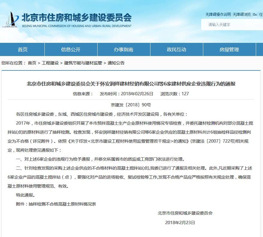 【水泥人網(wǎng)】日前,北京市住房和城鄉(xiāng)建設(shè)委員會(huì)通報(bào)了6家建材供應(yīng)企業(yè)的違規(guī)行為。通報(bào)文件稱2017年,市住房城鄉(xiāng)建設(shè)委組織開展了本市預(yù)拌混凝土生產(chǎn)企業(yè)原材料使用情況專項(xiàng)檢查,并委托建材檢測(cè)機(jī)構(gòu)對(duì)部分混凝土攪拌站(點(diǎn))的原材料進(jìn)行了抽樣檢測(cè)。