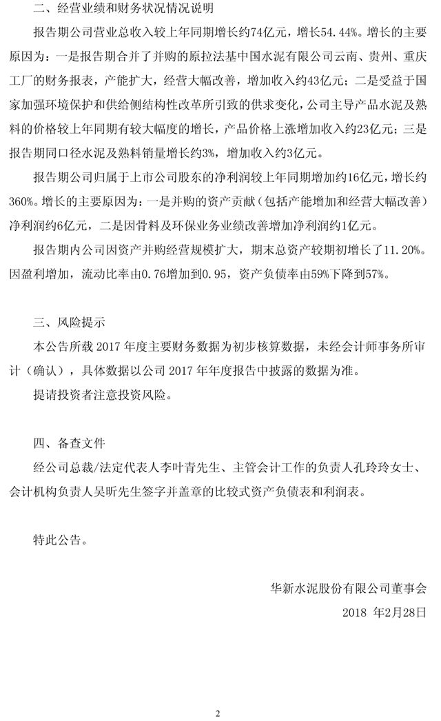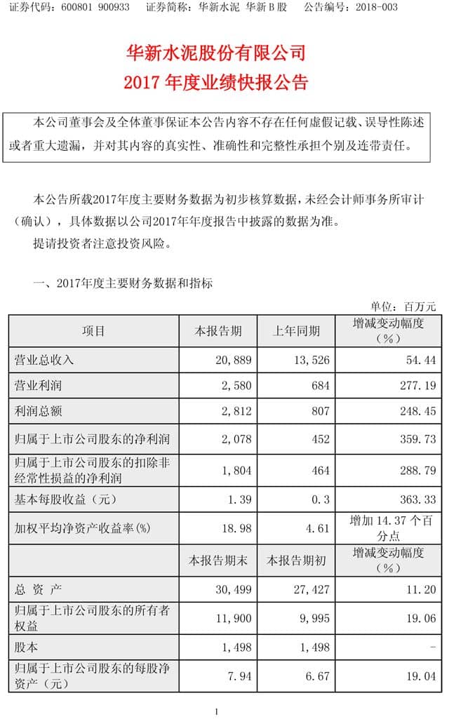 【水泥人網】華新水泥昨日(27日)晚間發(fā)布業(yè)績快報,公司2017年營收208.89億元,同比增長54.44%;凈利潤20.78億元,同比增長359.73%;