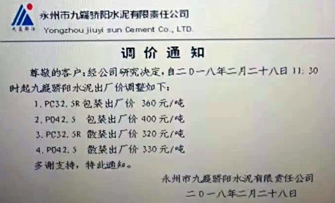 本公司決定在2018年2月28日上午9:00時(shí)開(kāi)始,全線品牌水泥(含水泥散粉)在原價(jià)格的基礎(chǔ)上下調(diào)20元/噸,順祝生意興隆、萬(wàn)事如意!