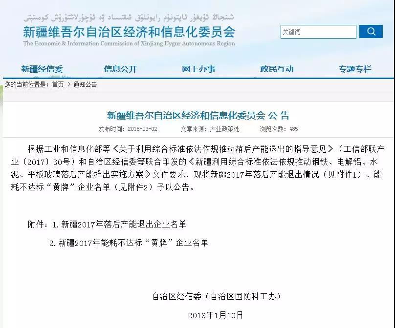 【水泥人網(wǎng)】日前,新疆維吾爾自治區(qū)經(jīng)濟(jì)和信息化委員會(huì)發(fā)布公告,公告稱根據(jù)工業(yè)和信息化部等《關(guān)于利用綜合標(biāo)準(zhǔn)依法依規(guī)推動(dòng)落后產(chǎn)能退出的指導(dǎo)意見》(工信部聯(lián)產(chǎn)業(yè)〔2017〕30號(hào))和自治區(qū)經(jīng)信委等聯(lián)合印發(fā)的《新疆利用綜合標(biāo)準(zhǔn)依法依規(guī)推動(dòng)鋼鐵、電解鋁、水泥、平板玻璃落后產(chǎn)能推出實(shí)施方案》文件要求,將新疆2017年落后產(chǎn)能退出情況、能耗不達(dá)標(biāo)“黃牌”企業(yè)名單予以公告。