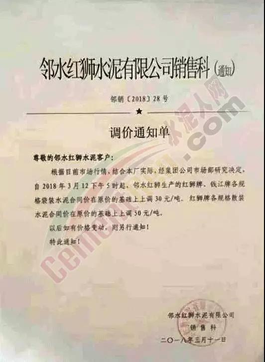 川東區(qū)域主導(dǎo)企業(yè)鄰水紅獅水泥調(diào)價通知稱:根據(jù)目前市場行情,結(jié)合本廠實際,經(jīng)集團公司市場部研究決定,自3月12日下午5時起,上調(diào)紅獅牌、錢江牌各規(guī)格袋裝水泥合同價在原價的基礎(chǔ)上上調(diào)30元/噸,紅獅牌各規(guī)格散裝水泥合同價在原價基礎(chǔ)上上調(diào)50元/噸。通知文原文如下