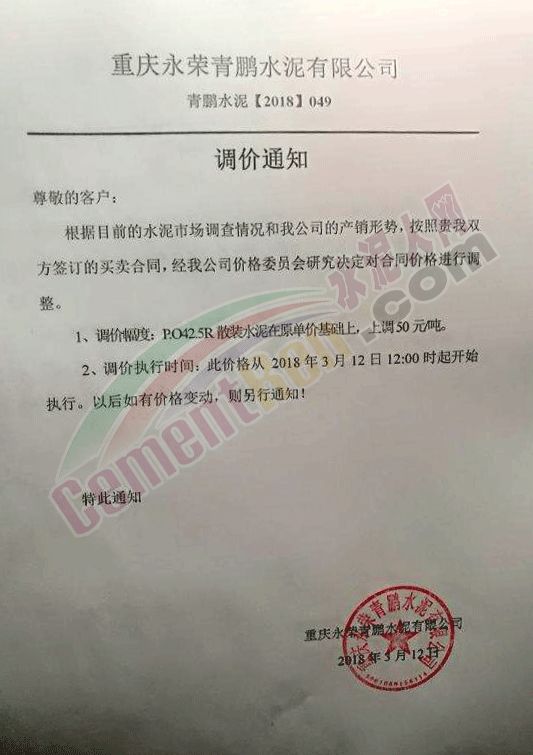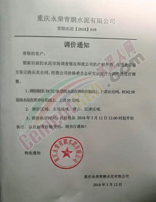 以上兩份調(diào)價(jià)通知,一份通知是PO42.5R散裝在原單價(jià)基礎(chǔ)上上調(diào)50元/噸, 另是一份是針對于重慶主城區(qū)、璧山,江津區(qū)域PC32.5R袋裝水泥在原單價(jià)基礎(chǔ)上上調(diào)10元/噸,PO42.5R袋裝水泥在原基礎(chǔ)上上調(diào)10元/噸。