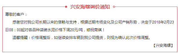 據(jù)了解廣西興安海螺曾在2月下旬發(fā)布降價通知,通知袋裝水泥下調(diào)20元/噸。