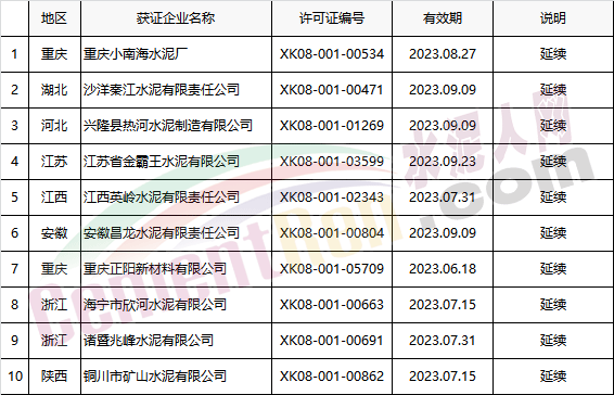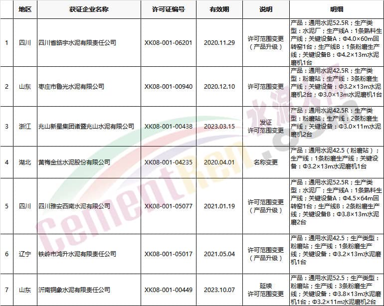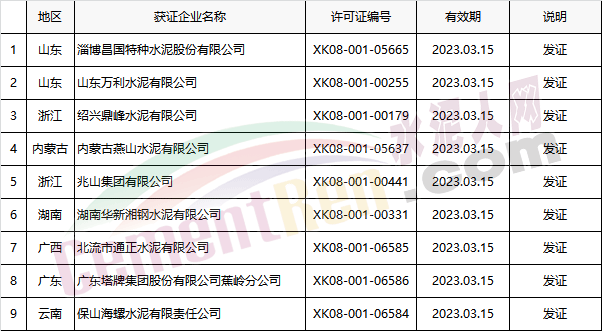 國家質(zhì)檢總局于本月16日發(fā)放第3批共26家水泥企業(yè)生產(chǎn)許可證。其中涉及新發(fā)證書的9家,涉及到期延續(xù)的10家,涉及相關(guān)項目或名稱變更的7家。