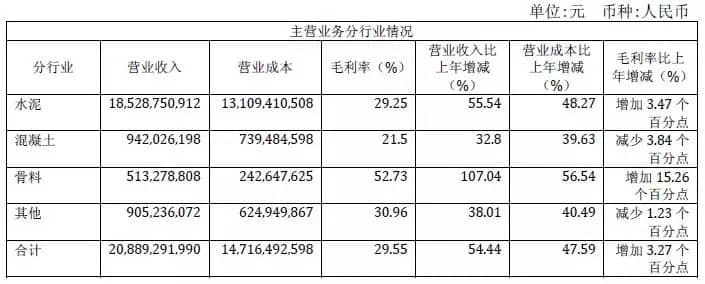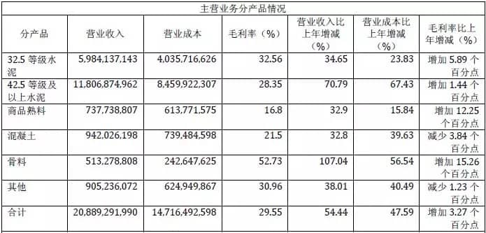2017年,公司實(shí)現(xiàn)水泥和熟料銷售總量6871.6萬(wàn)噸,同比增長(zhǎng)30.4%;銷售骨料1152.6萬(wàn)噸,同比增長(zhǎng)53.8%;環(huán)保業(yè)務(wù)處置總量181.6萬(wàn)噸,同比增長(zhǎng)21%;商品混凝土實(shí)現(xiàn)銷量319.3萬(wàn)方,同比增長(zhǎng)11.4%。全年公司實(shí)現(xiàn)營(yíng)業(yè)收入208.89億元,同比增長(zhǎng)54.44%;實(shí)現(xiàn)利潤(rùn)總額28.12億元,歸屬于母公司股東的凈利潤(rùn)20.78億元,分別較上年同期增長(zhǎng)248.46%和359.72%。