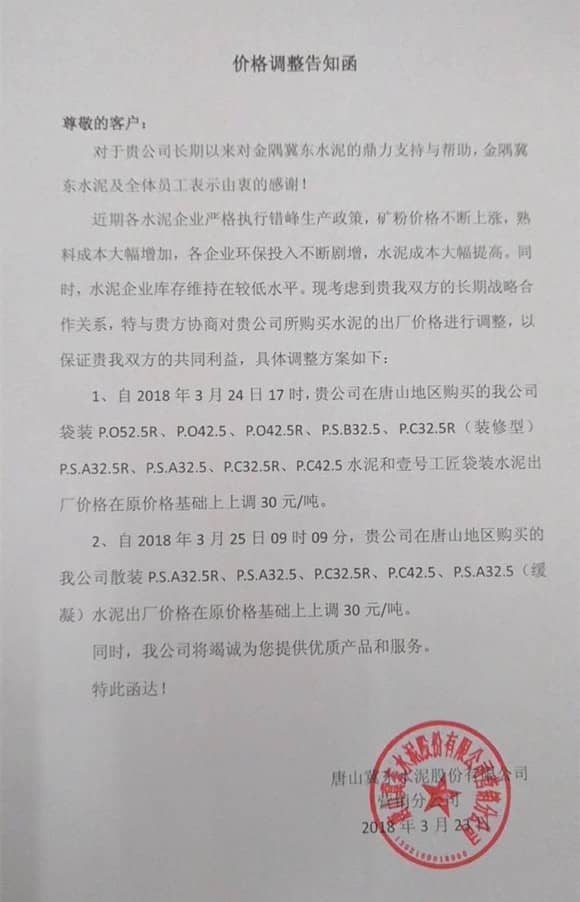 自2018年3月24日17時(shí)起,金隅冀東唐山地區(qū)袋裝P.O52.5R、P.O42.5、P.O42.5R、P.S.B32.5、P.C32.5R(裝修型)、P.S.A32.5R、P.S.A32.5、P.C32.5R、P.C42.5水泥出廠價(jià)和壹號(hào)工匠袋裝水泥出廠價(jià)格將在原價(jià)格基礎(chǔ)上再次上調(diào)30元/噸。