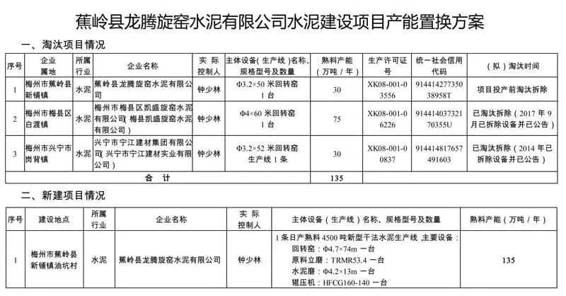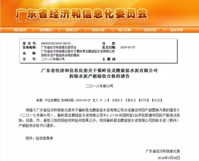 經(jīng)縣、市、省級三級現(xiàn)場驗收和驗收結(jié)果公示,現(xiàn)將蕉嶺縣龍騰旋窯水泥有限公司拆除水泥(熟料)產(chǎn)能驗收合格予以通告。 通告全文如下:
